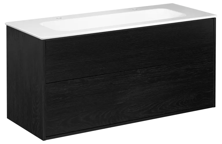 Musta pesuallaskaappi, 120 cm, jossa on kaksi laatikkoa ja valkoinen pesuallas, jossa on kaksi hanareikää. Pesuallaskaapissa on täysin katettu, ohut posliininen pesuallas, jossa reilusti laskutilaa.