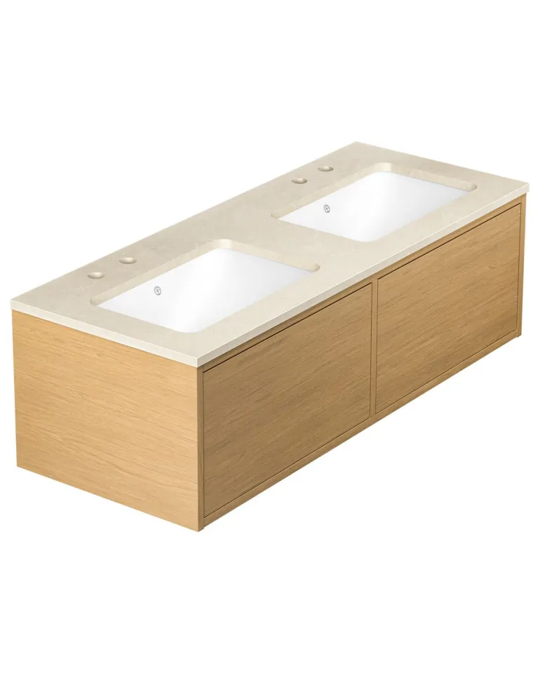 Gustavsbergin Ducentic -pesuallaskaappi keraamisella tai kivisellä allastasolla. Valittavissa myös tukikehyksellä tai ilman sekä yhdellä tai useammalla hanareiällä. Pesualtaassa on kaksi pesuallasta ja kaksi hanareikää (1+1) kahdelle yksireikäiselle hanalle.