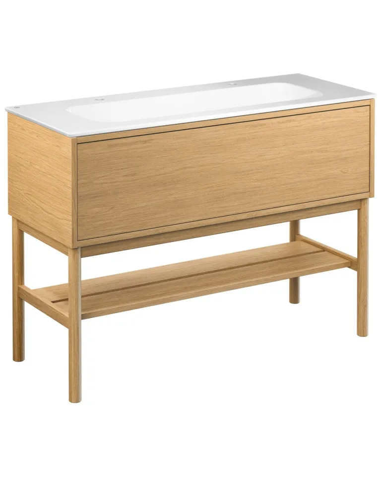 Gustavsbergin Ducentic -pesuallaskaappi kivitasolla ja tukikehyksellä. Pesualtaassa on kaksi hanareikää yhtä kaksireikäistä hanaa varten.