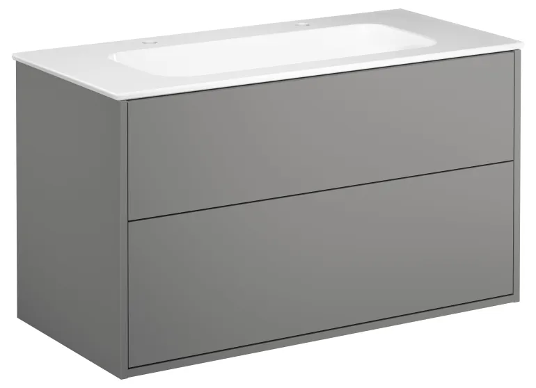 Tuhkanharmaa pesuallaskaappi, 100 cm, jossa kaksi laatikkoa ja valkoinen pesuallas, jossa on kaksi hanareikää. Pesuallaskaapissa on täysin katettu, ohut posliininen pesuallas, jossa reilusti laskutilaa.