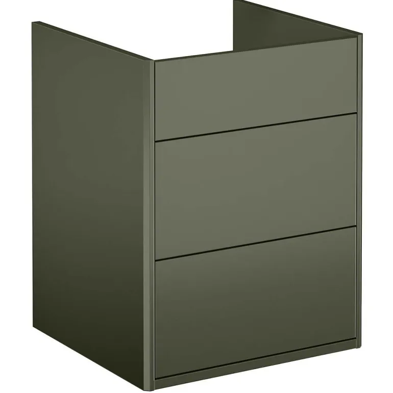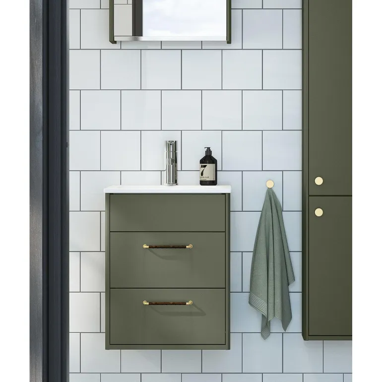 Pesuallaskaappi (45 cm) kokoleveällä pesualtaalla, pehmeästi sulkeutuvilla laatikoilla ja kapealla syvyydellä, joka tekee siitä soveltuvan myös pienempiin kylpyhuoneisiin. Kaapin rungon, ovien ja laatikoiden materiaali on kosteudenkestävää ja kylpyhuoneisiin tarkoitettua MDF-levyä.