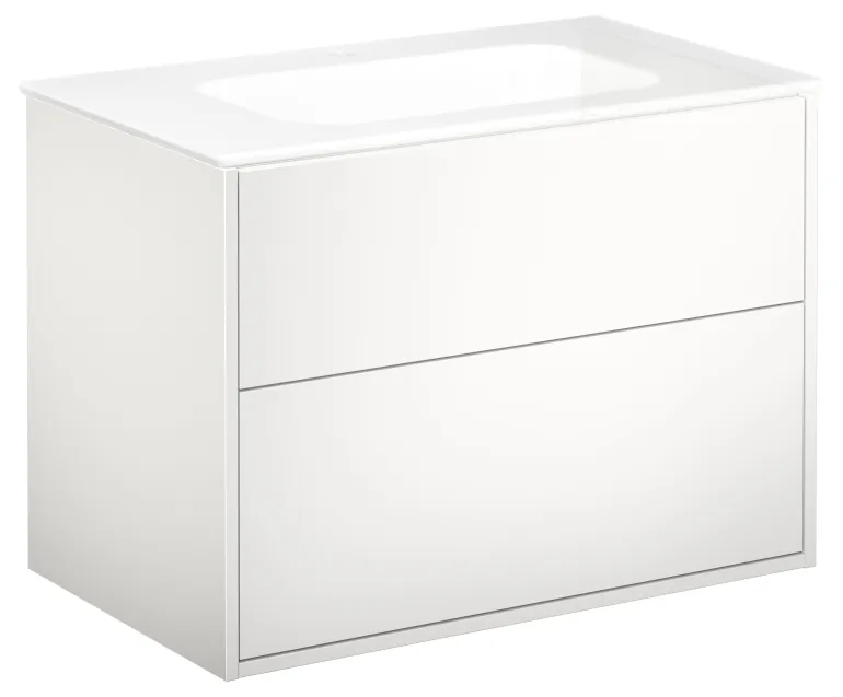 Valkoinen pesuallaskaappi kahdella laatikolla, ilman pesuallasta, 80 cm. Hiljaisesti ja pehmeästi sulkeutuvat, täysin ulosvedettävät vetolaatikot, joissa kaikki tarvikkeet ovat hyvin näkyvillä.