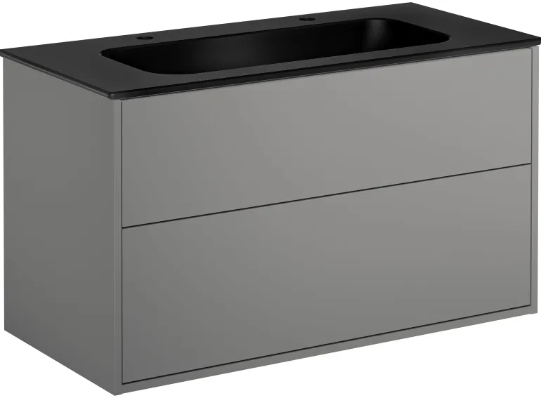 Tuhkanharmaa pesuallaskaappi, 100 cm, jossa kaksi laatikkoa ja mattamusta pesuallas, jossa on kaksi hanareikää. Pesuallaskaapissa on täysin katettu, ohut posliininen pesuallas, jossa reilusti laskutilaa.