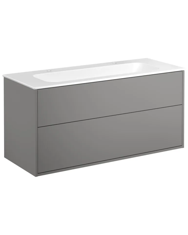 Pesuallaskaappi valkoinen, jossa mattavalkoinen täysin katettu, ohut posliininen pesuallas yhdellä hanareiällä. Asennusjärjestelmä, jonka avulla asennus ja säätö on helppoa ja nopeaa. Allaskaapin leveys 98 cm/allastason leveys 100 cm. Allaskaapissa on kaksi pehmeästi ja hiljaisesti sulkeutuvaa sekä kokonaan ulosvedettävää laatikkoa, joista tavarat löytyvät helposti. Saatavana eri väreissä (sekä allaskaapit että pesualtaat). Pesualtaat saatavina perinteisen kiiltävän valkoisena, mattavalkoisena tai mattamustana.