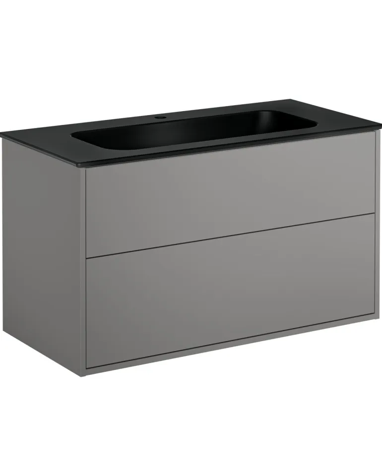 Pesuallaskaappi tuhkanharmaa, jossa mattavalkoinen täysin katettu, ohut posliininen pesuallas kahdella hanareiällä. Asennusjärjestelmä, jonka avulla asennus ja säätö on helppoa ja nopeaa. Allaskaapin leveys 118 cm/allastason leveys 120 cm. Allaskaapissa on kaksi pehmeästi ja hiljaisesti sulkeutuvaa sekä kokonaan ulosvedettävää laatikkoa, joista tavarat löytyvät helposti. Saatavana eri väreissä (sekä allaskaapit että pesualtaat). Pesualtaat saatavina perinteisen kiiltävän valkoisena, mattavalkoisena tai mattamustana.