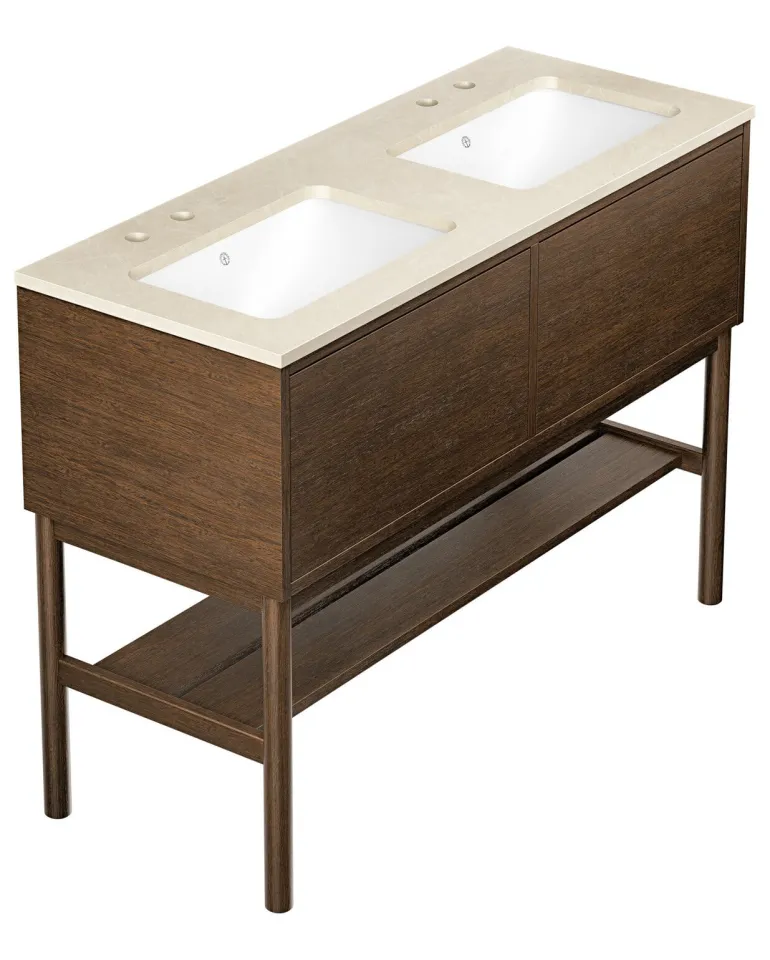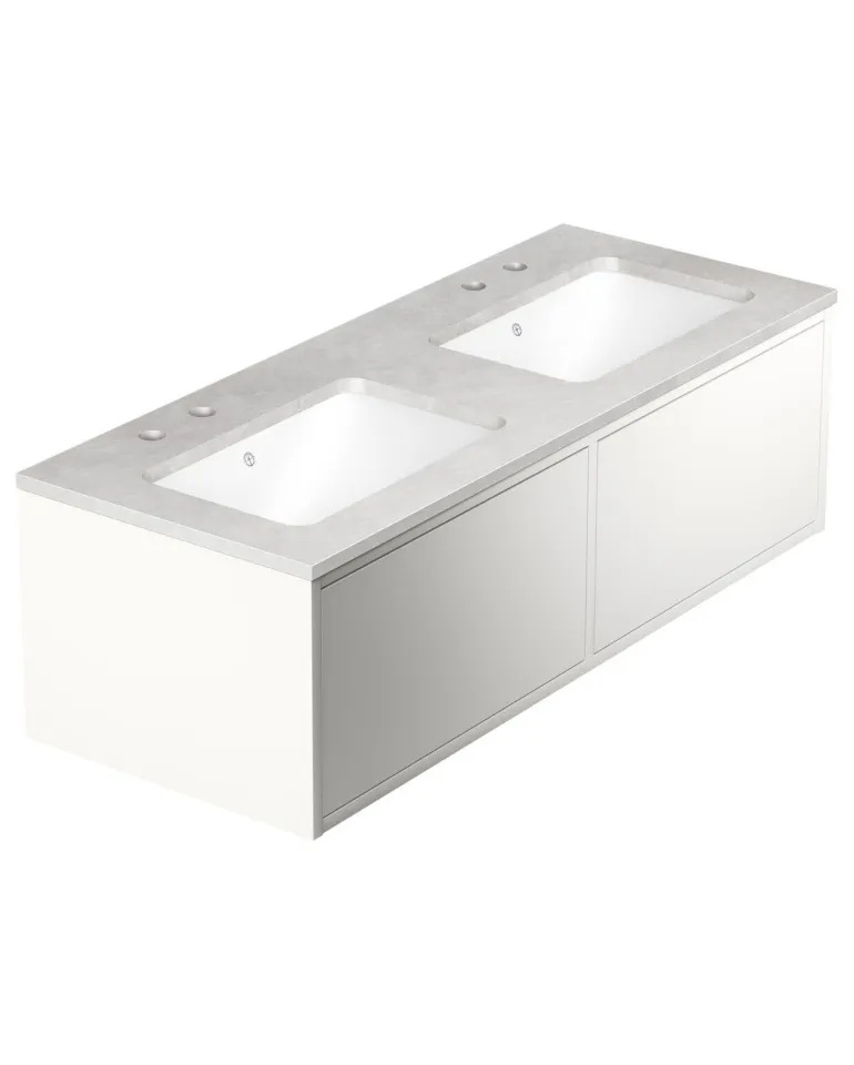 Gustavsbergin Ducentic -pesuallaskaappi keraamisella tai kivisellä allastasolla. Valittavissa myös tukikehyksellä tai ilman sekä yhdellä tai useammalla hanareiällä. Pesualtaassa on kaksi hanareikää (1+1) kahdelle yksireikäiselle hanalle.