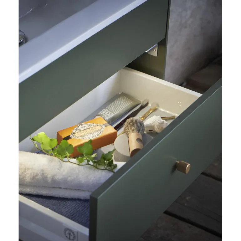 Pesuallaskaappi (100 cm) kokoleveällä pesualtaalla ja pehmeästi ja hiljaisesti sulkeutuvilla laatikoilla. Kapea syvyyssuunnassa, ja mahtuu näin hyvin pienempäänkin kylpyhuoneeseen. Materiaali kylpyhuoneisiin tarkoitettua kosteudenkestävää MDF-levyä.