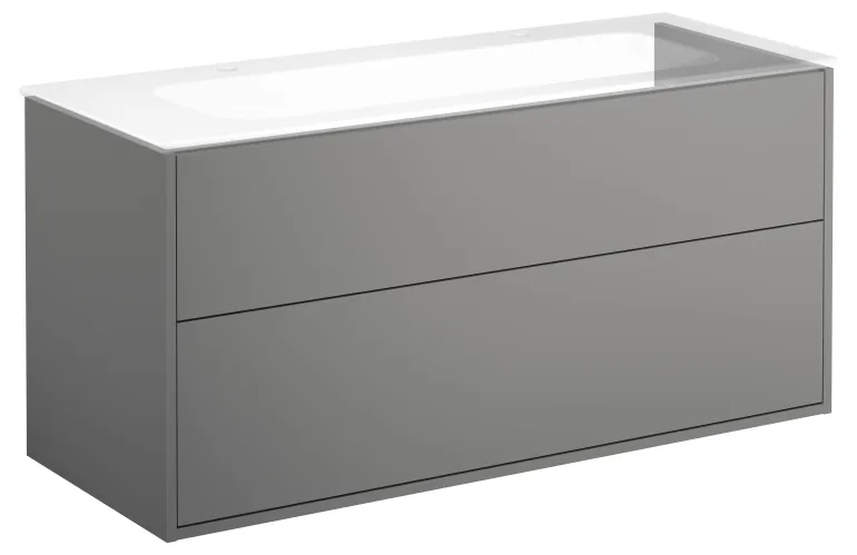 Tuhkanharmaa pesuallaskaappi kahdella laatikolla, ilman pesuallasta, 120 cm. Hiljaisesti ja pehmeästi sulkeutuvat, täysin ulosvedettävät vetolaatikot, joissa kaikki tarvikkeet ovat hyvin näkyvillä.