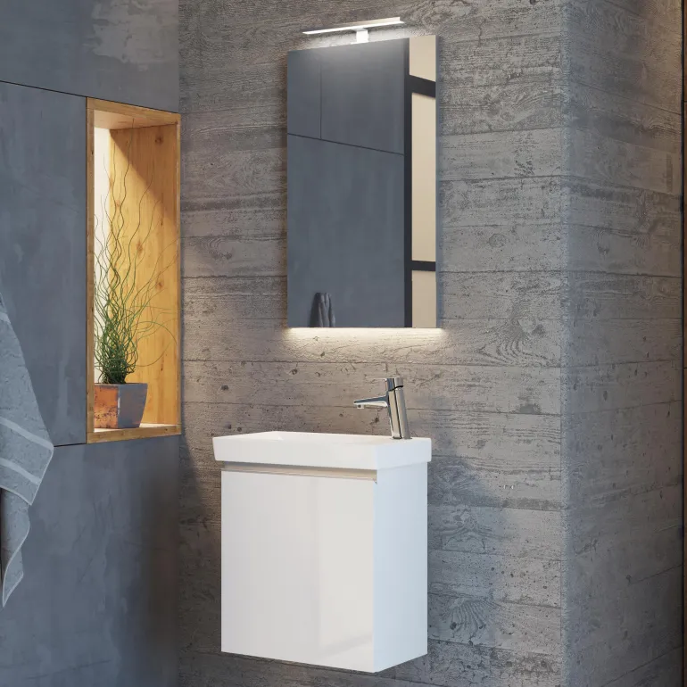 Allaskaappi korkeakiiltoisesta kosteutta kestävästä lastulevystä (väri valkoinen). Pesuallaskaapin kaksi täysin ulosvedettävää laatikkoa ovat 3D-lämpölaminoituja, mikä tekee niistä erittäin kestäviä ja kosteutta kestäviä – ihanteellisia kylpyhuoneympäristöön.