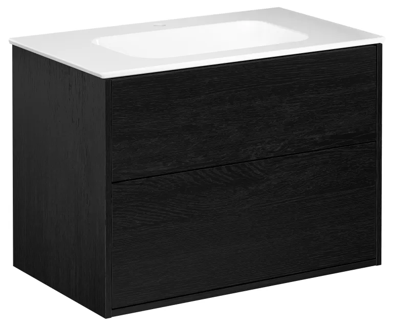 Musta pesuallaskaappi, jossa on kaksi laatikkoa ja valkoinen pesuallas, 80 cm. Pesuallaskaapissa on täysin katettu, ohut posliininen pesuallas, jossa reilusti laskutilaa.