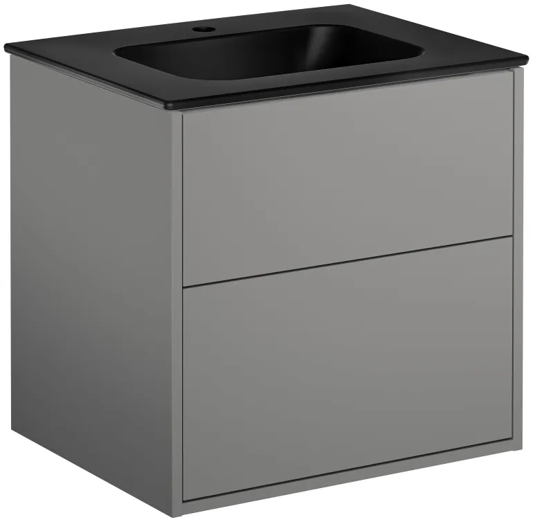 Tuhkanharmaa pesuallaskaappi, jossa on kaksi laatikkoa ja mattamusta pesuallas, 60 cm. Pesuallaskaapissa on täysin katettu, ohut posliininen pesuallas, jossa reilusti laskutilaa.