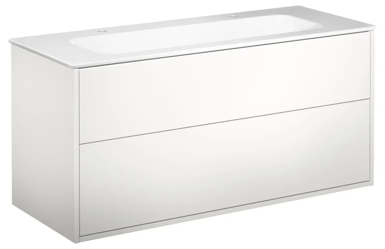 Valkoinen pesuallaskaappi, 120 cm, jossa on kaksi laatikkoa ja valkoinen pesuallas sekä kaksi hanareikää. Pesuallaskaapissa on täysin katettu, ohut posliininen pesuallas, jossa reilusti laskutilaa.