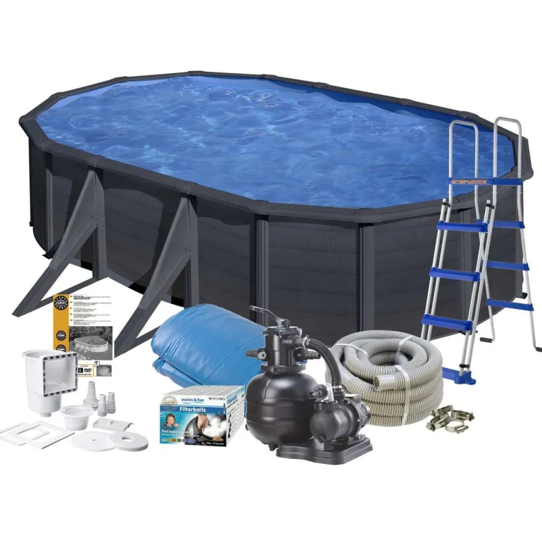 Uima-allaspaketti perheeseen, jossa ei ole aivan pieniä lapsia. Sisältää kaikki tarvikkeet erillisen uima-altaan asentamiseen puutarhaan tai kesämökille. Allas on soikea, musta ja UV-suojattu. Altaan mitat ovat 5 x 3 m ja korkeus 1,20 m, mikä tarjoaa runsaasti tilaa erilaisille vesileikeille. Luja moninkertaisesti käsitelty terässeinämäinen allas, joka on varustettu tehokkaalla ja ammattimaisella suodatinjärjestelmällä ja pintapuhdistimella.