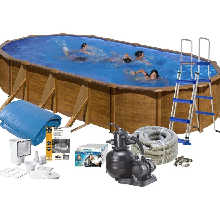 Uima-allaspaketti perheeseen, jossa ei ole aivan pieniä lapsia. Sisältää kaikki tarvikkeet erillisen uima-altaan asentamiseen puutarhaan tai kesämökille. Uima-allas on soikea ja muistuttaa ulkonäöltään luonnollista puuta. Altaan mitat ovat 6,1 x 3,75 m ja korkeus 1,20 metriä, mikä tarjoaa runsaasti tilaa erilaisille vesileikeille. Luja moninkertaisesti käsitelty terässeinämäinen allas, joka on varustettu tehokkaalla ja ammattimaisella suodatinjärjestelmällä ja pintapuhdistimella.