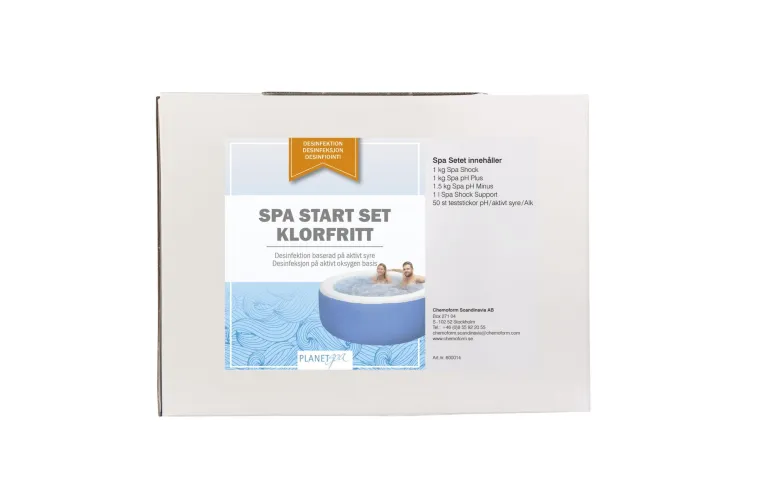 Porealtaan klooriton aloituspakkaus, joka sisältää 1 kg Spa Shock -rakeita, 1 litran Spa Shock Support -ainetta, Spa pH-Plus- (1 kg) ja Spa pH-Minus (1,5 kg) -happamuudensäätöaineita sekä 50 testiliuskaa pH-arvon/aktiivisen hapen/emäksisyyden mittaamista varten.