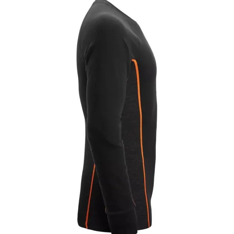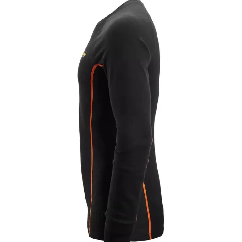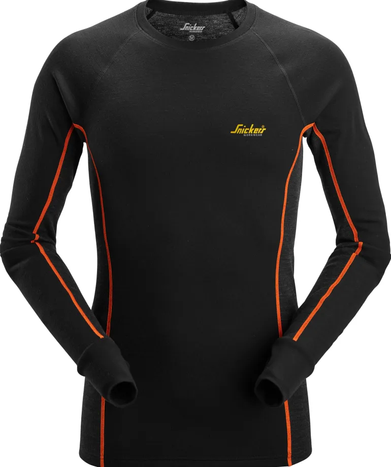 Toiminnallinen merinoaluskerraston yläosa kylmissä olosuhteissa työskentelyyn. Kaksinkertaisesta neuloksesta tehty rakenne, jossa yhdistyvät villan lämpö ja erinomaiset kosteutta siirtävät ominaisuudet. Suunniteltu mukavuutta ja parasta suorituskykyä varten kylmiin olosuhteisiin. Tässä toiminnallisessa aluskerraston yläosassa on kaksinkertainen neulottu rakenne. Ulkopinta on valmistettu 100 % mulesing-vapaasta merinovillasta, joka on erittäin lämmin. Synteettisistä kuiduista valmistettu sisäpuoli siirtää tehokkaasti kosteutta pois iholta aiheuttamatta kutinaa. Yläosassa on koristeelliset tasosaumat hankautumisen minimoimiseksi. Peukaloreiät hihansuissa lisäävät mukavuutta. Snickers Workwear -logo.