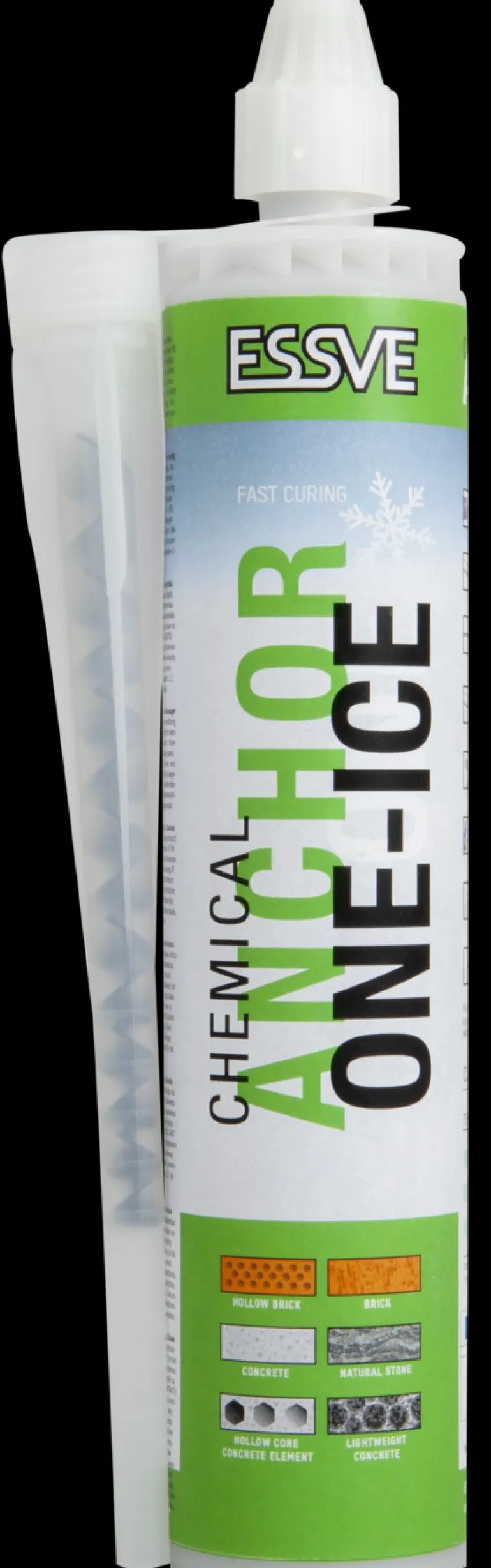 ESSVE One-ICE -ankkurimassa on kemiallinen kiinnitysmassa, joka on tarkoitettu laatuluokitettuihin sovelluksiin. Ankkurimassa ONE-ICE on CE-merkitty ja hyväksytty kierretankojen, vaarnapulttien ja raudoitusrautojen asentamiseen sekä halkeilevaan että halkeilemattomaan betoniin. ESSVE One-ICE on erityisesti suunniteltu asennettavaksi pakkaslämpötiloissa, ja tuotteen kovettumis- ja käsittelyaika on mukautettu lämpötila-alueelle -20 °C – +10 °C. Huoneenlämmössä asennukseen suositellaan sen sijaan ESSVE ONE -vakiotuotetta. Tuote soveltuu yleiseen asennukseen aggressiivisissa ympäristöissä, laitureilla ja satamissa sekä muihin sovelluksiin, joissa kiinnityksen turvallisuudelle on tiukat vaatimukset.