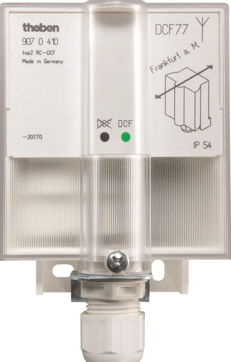 Radio-ohjaus antennin kautta top2 RC -yksiköillä: Hyvän vastaanoton varmistamiseksi älä asenna antennia kellariin tai jakajarasioihin. Liitäntä tehdään erillisellä kaksijohtimisella suojaamattomalla suurjännitekaapelilla (korkeintaan 100 m), enintään 10 kpl Theben top2 RC -yksikköä voidaan kytkeä. Napaisuus, oikosulku ja katkos antennipiirissä osoitetaan visuaalisesti asennuksen helpottamiseksi.