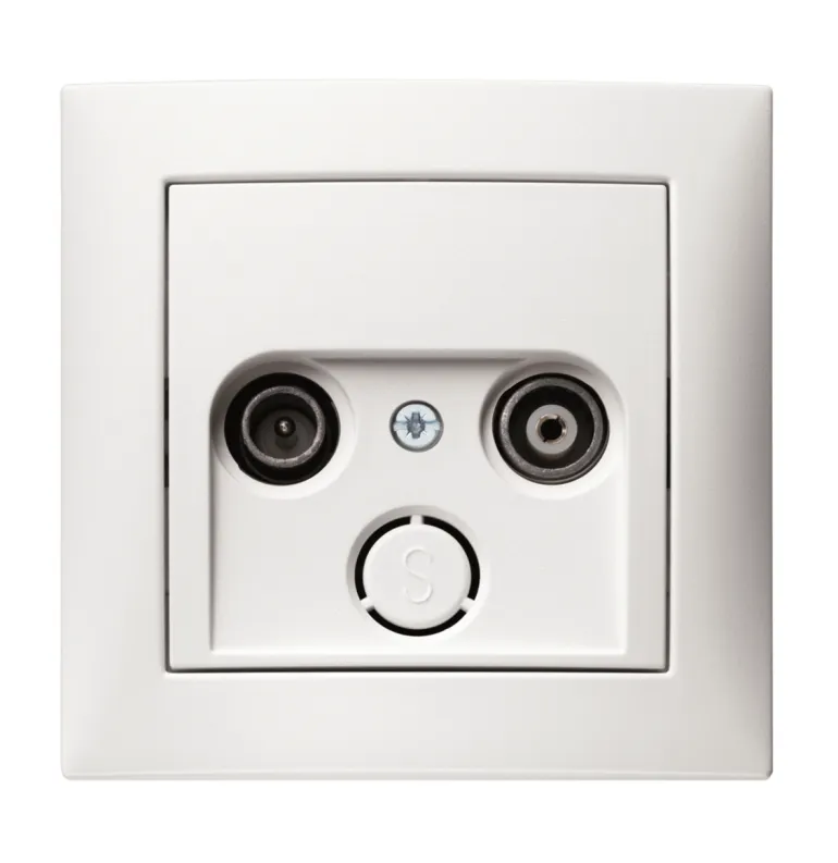 Antennipistoke radio- ja TV-liitännällä, 75 ohmia. Sarjan S1 antrasiitinvärinen läpivientipistorasia, jossa 15 dB:n vaimennus. Uppoasennus IP20 kojerasiaan C/C 60 tai pinta-asennus korotuskehykseen.