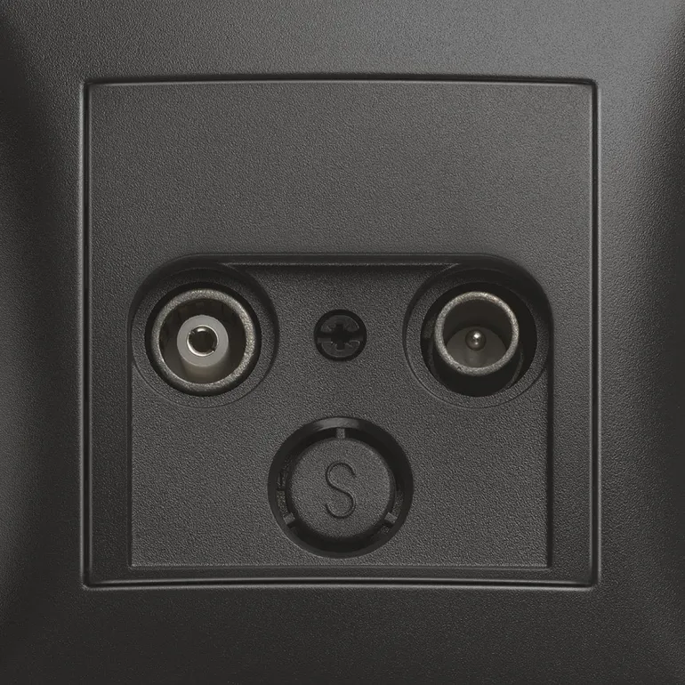 Antennipistoke radio- ja TV-liitännällä, 75 ohmia. Sarjan S1 antrasiitinvärinen läpivientipistorasia, jossa 15 dB:n vaimennus.
