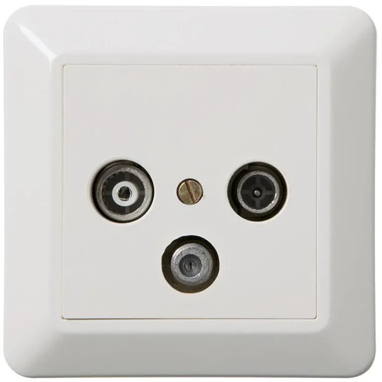 Seinäpistorasia radiolle, televisiolle ja satelliitille. Sisältää liittimet ja päätevastuksen. Valkoinen, mitat 84 x 84 mm.