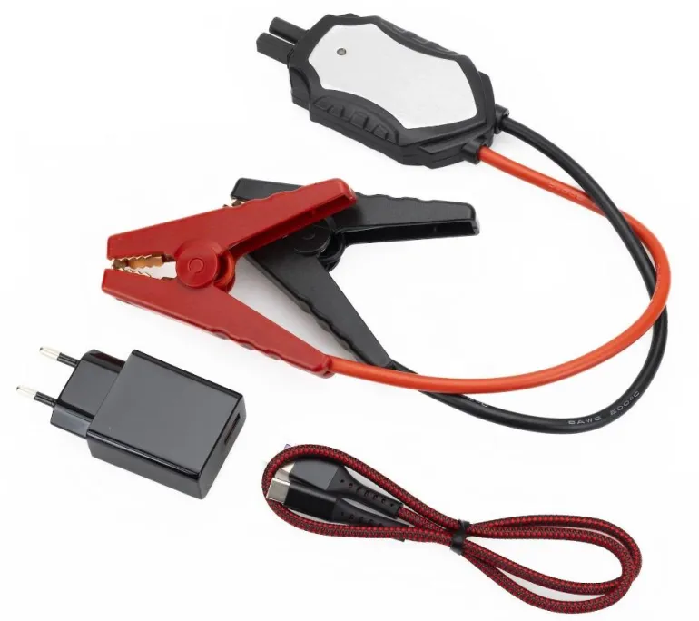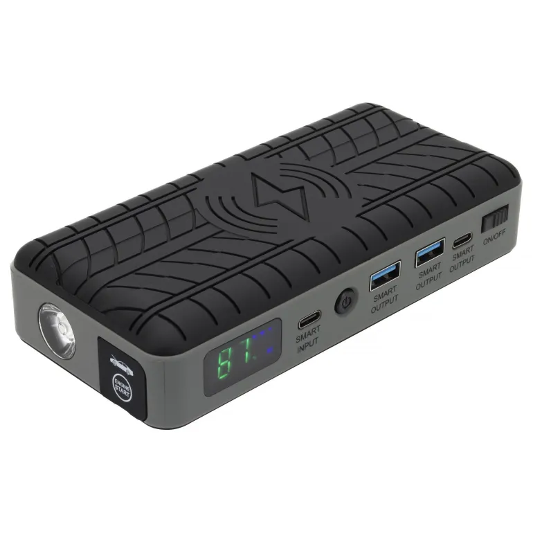 Laitteessa on liitännät myös muiden laitteiden lataamiseen: 1 kpl USB-C ja 2 kpl USB-A. Laite ladataan mukana tulevalla USB-C-kaapelilla ja laturilla. Toimitetaan kätevässä laukussa, sisältäen myös kaapelit apuvirran antamiseen.