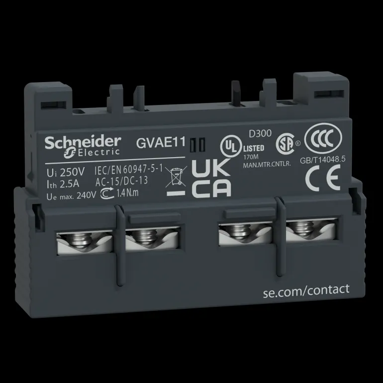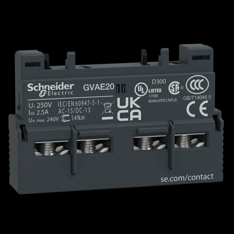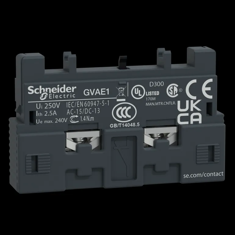 Schneider Electric GVAE1 apukosketinlohko, TeSys GV2 & GV3, 1 sulkeva tai 1 katkaiseva. Käännettävä, etuosaan asennettava.