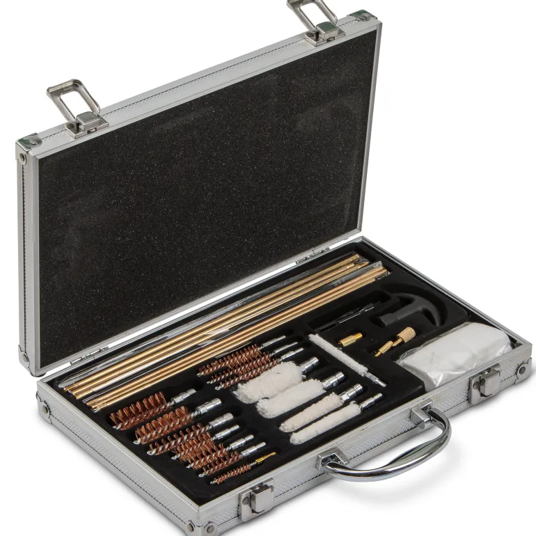 Suuri puhdistussarja pistooleille, kivääreille ja haulikoille. Kätevä säilytyslaatikko, joka sisältää aseiden puhdistamiseen tarvittavat kahvat, tangot ja harjat. Mukana ovat harjat yleisimmille kalibreille sekä useita vetokielekkeitä.