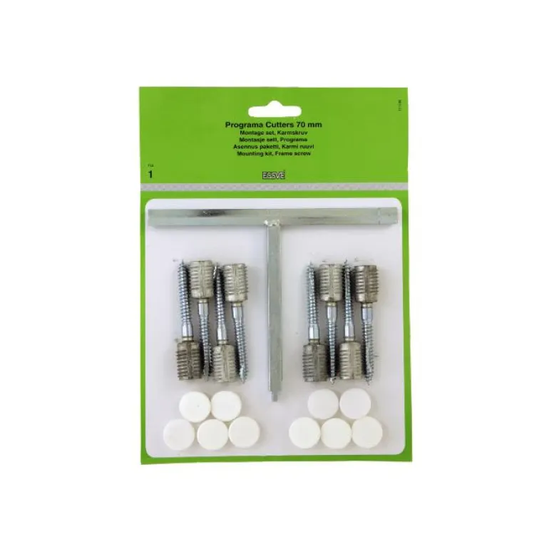 Täydellinen asennussarja kahden ikkunan tai yhden oven kiinnittämiseen. Mukana oleva Programa-karmiruuvi on kehitetty vähentämään karmiaukon puukoolauksen halkeamisriskiä.