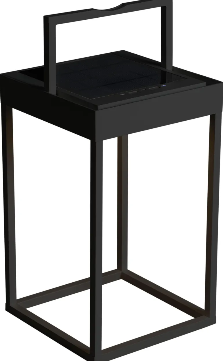 Musta alumiininen aurinkolamppu ulkokäyttöön. Latautuu aurinkokennoilla, voidaan ladata myös USB:llä.