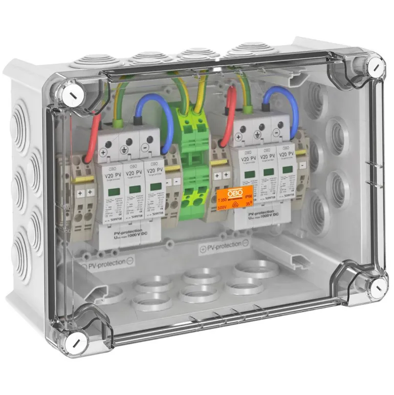 Ylijännitesuoja aurinkokennojen suojaamiseksi DC-puolella. Valmiit sisäiset kytkennät kahta haaraa varten. Asennuksiin, joissa ei ole ulkoista salamasuojausta tai joissa erotusetäisyyttä ei voida ylläpitää ulkoisella salamansuojauksella SS EN 62305 -standardin mukaisesti. Ylijännitesuojan maadoitus liitetään potentiaalintasausjärjestelmään. Järjestelmän jännite 1000 V DC. Muita jännitteitä pyynnöstä. Kotelo halogeenitonta UV-säteilyn kestävää polypropeenia. Läpiviennit 16 X M / 8 x M40. Kytkentäpinta-ala 0,5–10 mm² (monisäikeinen 6 mm²)