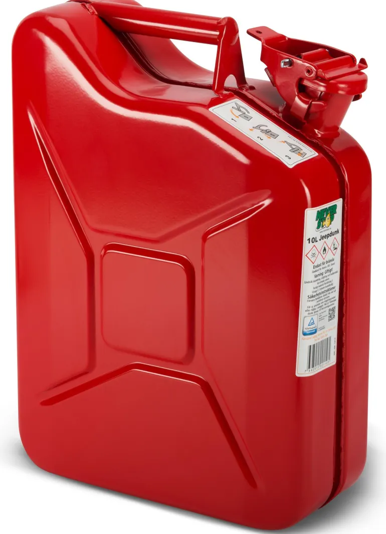 Polttoainekanisteri vahvaa teräslevyä. Maalattu. Punainen. Ruostesuojakäsitelty sisältä ja ulkoa. Lukitustappi.