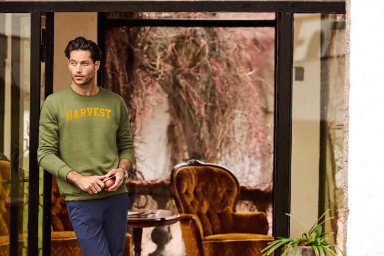 James Harvest Alder Heights on luomupuuvillasta valmistettu collegepaita pyöreällä kaula-aukolla ja harjatulla sisäpuolella.