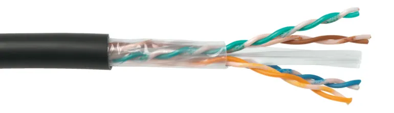 Suojaamaton Kat6 U/UTP -datakaapeli 4xAWG24 (250 MHz) ulkokäyttöön. Kaapelissa on kaksoisvaippa, sisävaippa on PE:tä ja ulkovaippa on mustaa halogeenitonta materiaalia Eca s2 d2 a2.