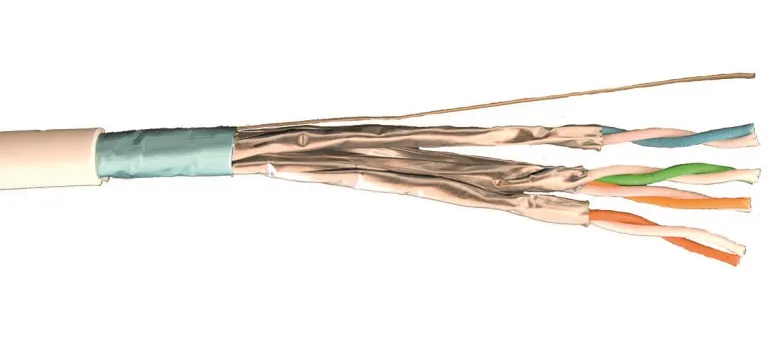 Kaapeli F/FTP C6A. Suojattu 4-parinen kaapeli, kukin pari on suojattu erikseen foliosuojalla ja lisäfoliosuoja kaikkien neljän parin ympärillä.