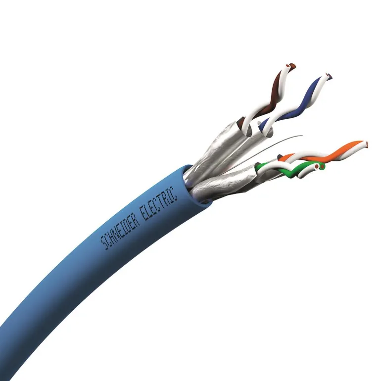 Suojattu Kat6A U-FTP -datakaapeli AWG23 (550 MHz) sisäkäyttöön jakeluverkoissa. Kaapelissa on sininen halogeeniton ulkovaippa Dca s2d2a1 ja kaapeliin on painettu metriasteikko.
