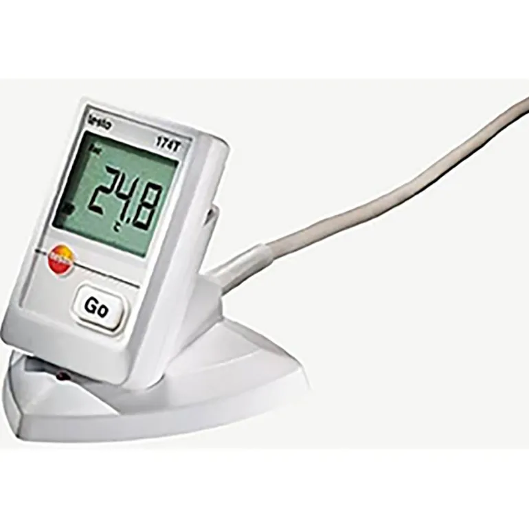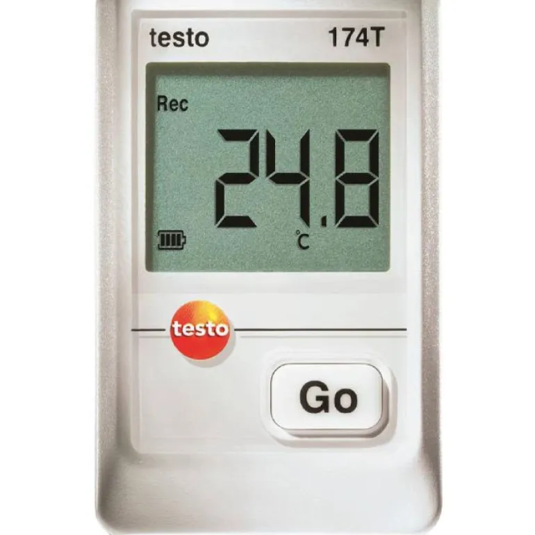 Testo 174-T on kompakti dataloggeripaketti lämpötilalle. Testo 174-T on suojausluokan IP65 mukaisesti vedenpitävä, ja siinä on näyttö, josta näkyvät virtausmittausarvot, enimmäis- ja vähimmäisarvot sekä mittaustiedot. Loggerissa on 16 000 mittausarvon muisti ja sitä voidaan käyttää lähes kaikkialla, missä lämpötiloja on seurattava ja dokumentoitava. Säilyttää tallennetut mittaustiedot virtakatkon varalta. Ihanteellinen esimerkiksi erityyppisten tilojen tarkastamiseen tai sen varmistamiseen, että jäähdytys- tai pakastusketju ei katkea. Sopii myös lämpövalvottujen alueiden seurantaan, joissa säilytetään ja käsitellään lämpöherkkiä tuotteita. Testo ComSoft Basic 5:llä dataa ja asetuksia siirretään pöytätietokoneen tai kannettavan tietokoneen kautta ja siinä on ruotsinkielinen käyttäjäystävällinen tietokoneohjelmisto. Mitat 36 x 60 x 19 mm.