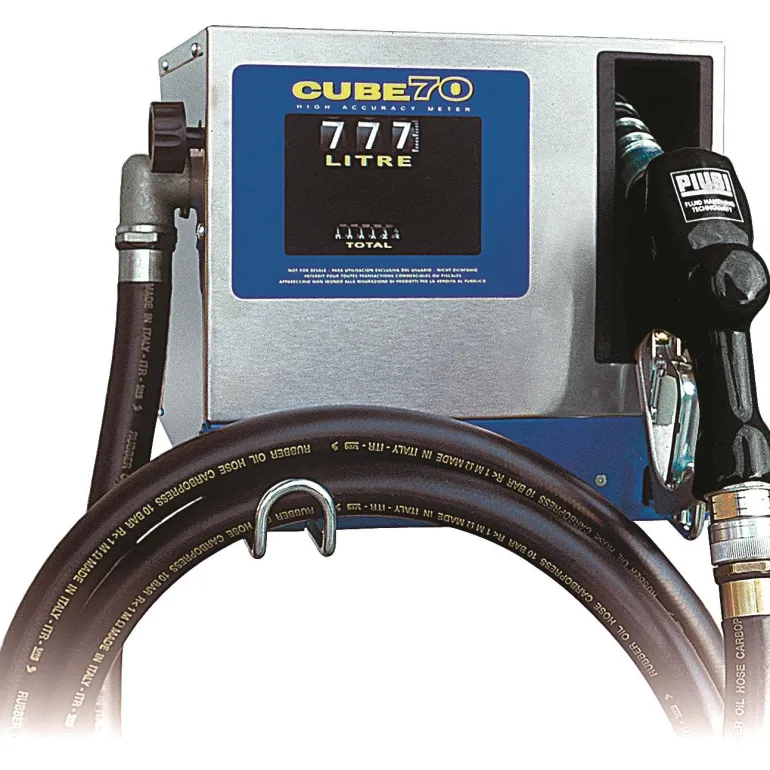 Dieselpumppu, jossa ohitusventtiili ja virtausmittari, tilavuus 70 l/min. Virtausmittari näyttää, kuinka paljon olet tankannut ja polttoaineen kokonaisottomäärän. Cube 70:ssa on 3-numeroinen nollauslaskuri ja 6-numeroinen kokonaislaskuri.
