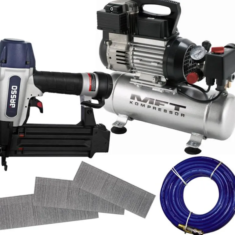 Naulainpakkaus sisältää Basso B18/55-F1-viimeistelynaulaimen, MFT 105/OF -kompressorin, MFT 53020014 -paineilmaletkun ja 5 000 kpl 30 mm:n, 40 mm ja 50 mm:n nauloja, yhteensä 15 000 naulaa!
