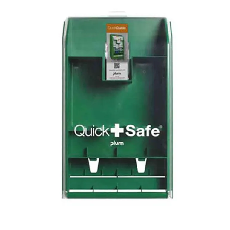 Tyhjä Plum QuickSafe on ensiapuasema seinäasennukseen. Se on valmistettu muovista ja siinä on läpinäkyvä kansi. Asema täytetään esimerkiksi silmähuuhtelupulloilla ja muilla kohteen tarpeisiin sopivilla ensiaputuotteilla.
