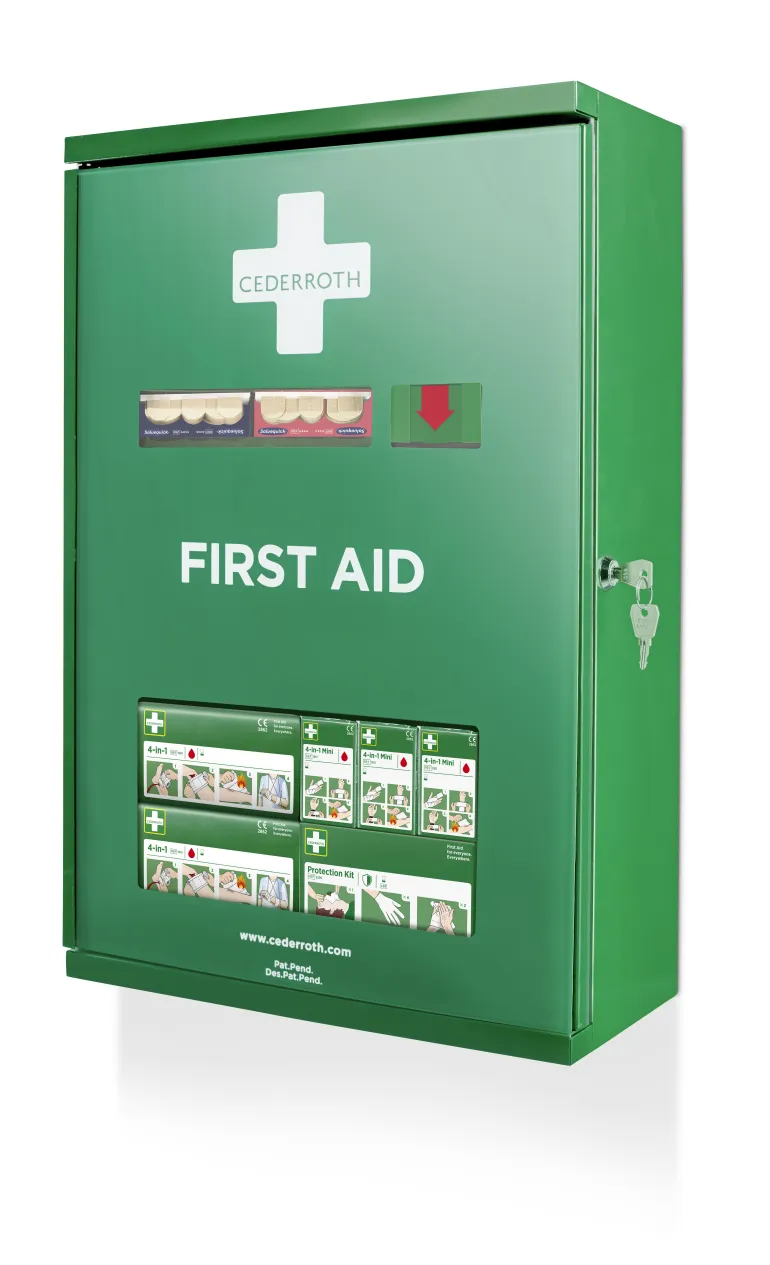 Cederrothin ensiapukaappi sopii erityisesti vaativiin työympäristöihin, joissa altistutaan esimerkiksi lialle, pölylle ja kosteudelle. Sopii paikkoihin, joissa tarvitaan laajempaa ensiapuvarustusta.