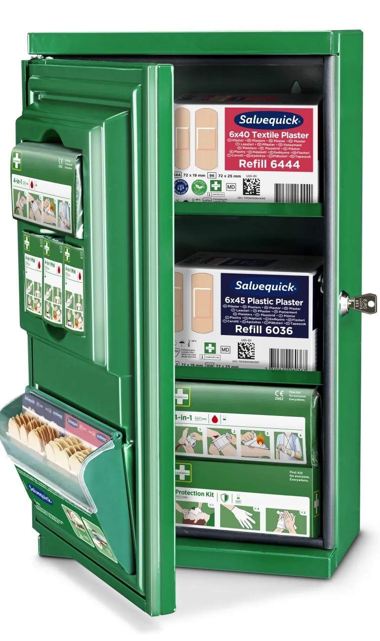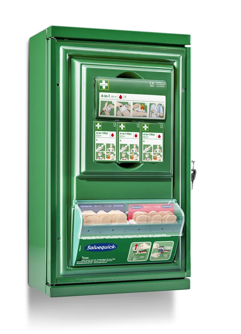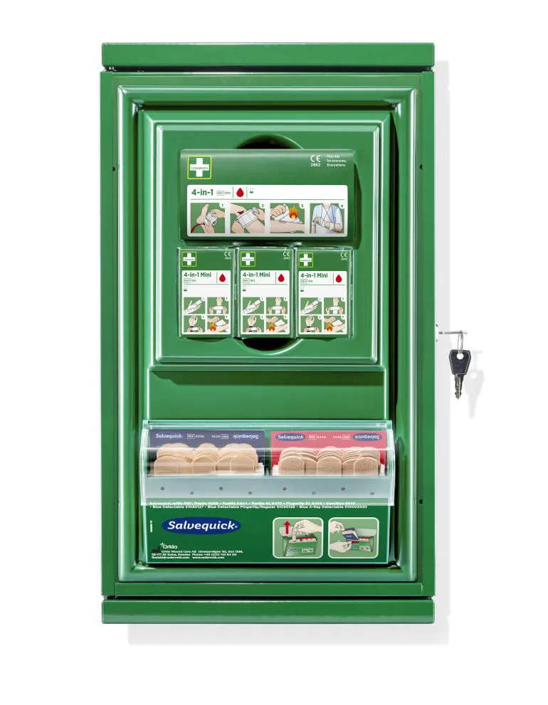 Lukittava peltikaappi, jossa on pienoispaneeli oveen asennettuna. Sopii paikkoihin, joissa tarvitaan laajempaa ensiapuvarustusta. Sisältää mm. ensiapusiteen, laastariautomaatin ja laastaria, sakset ja pinsetit.