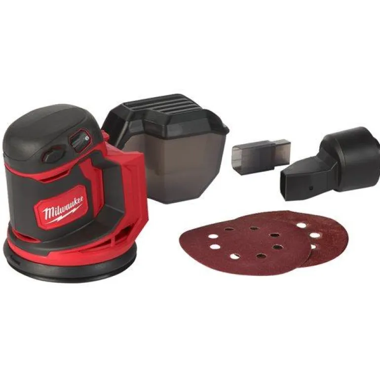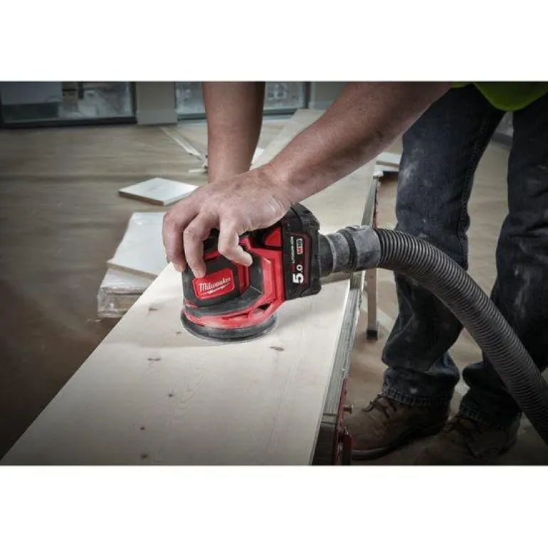 Milwaukee M18 BOS125-502B 18 V epäkeskohiomakone tuottaa 14 000– 20 000 hiontaa minuutissa. Hiomakoneessa on 125 mm hiontalevy ja imuadapteri.