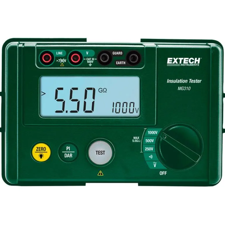 Extech MG310 -eristysmittalaitteen avulla moottorien, muuntimien ja muiden teollisuuslaitteiden testaus ja vianmääritys on helppoa ja nopeaa. Valaistu näyttö, jossa on 2000 kuvapistettä.