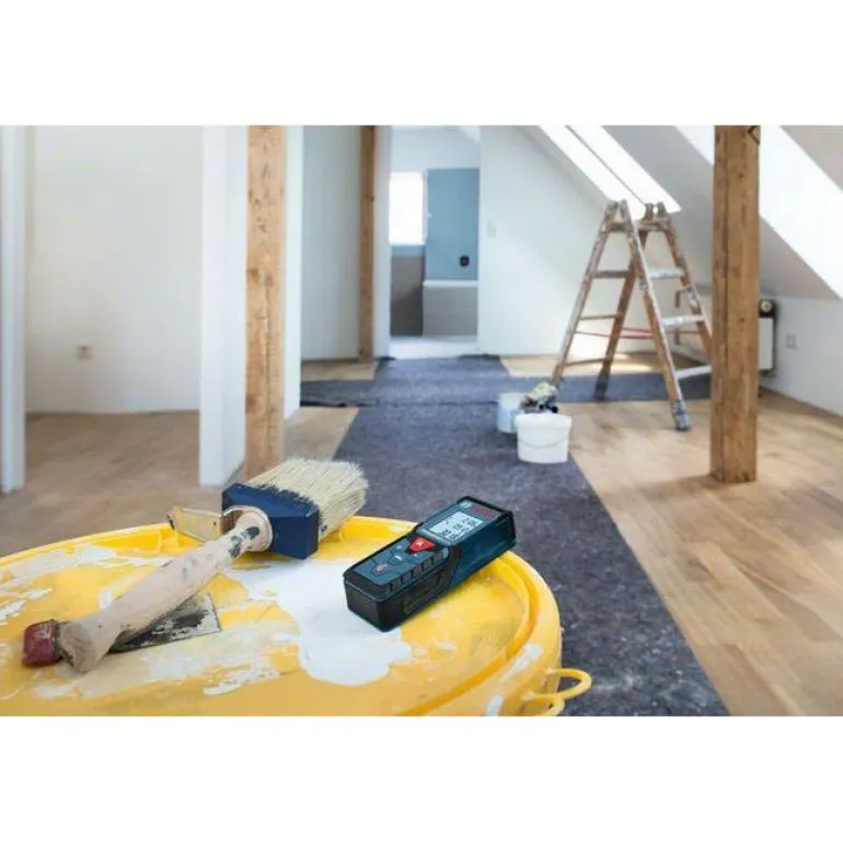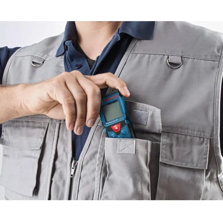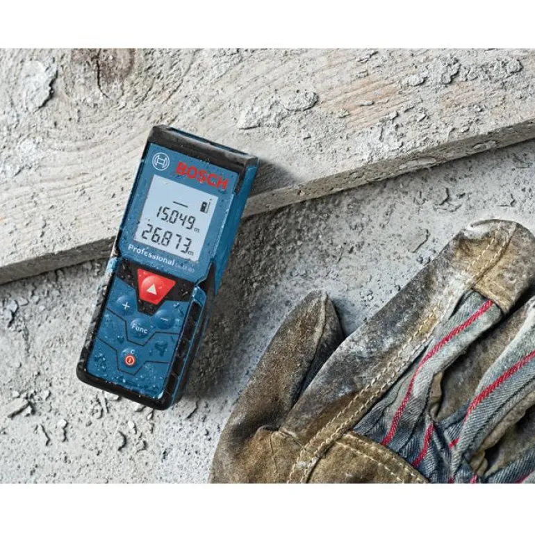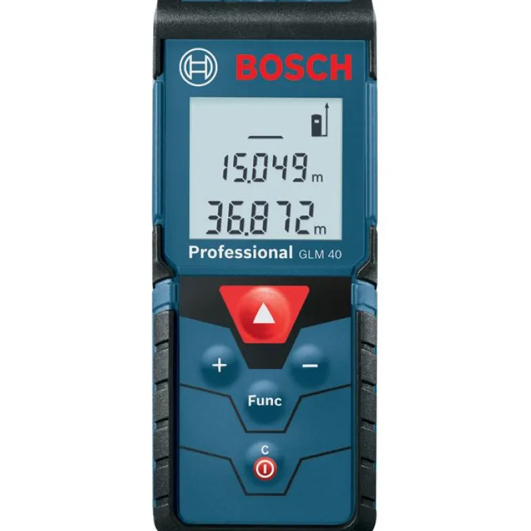 Bosch GLM 40 Professional on rakentajien suosima vankka etäisyysmittari. Helppokäyttöisessä etäisyysmittarissa on Softgrip-kädensija. Selkeät painikkeet ja helppolukuinen näyttö. Raskaaseen käyttöön, IP54: suojattu kestämään rakennustyömaan pölyä, roiskevettä ja iskuja. Lasermittarin muistiin voi tallentaa 10 mittausta, mittari laskee pinta-alat ja tilavuudet sekä Pythagoraan lauseen.