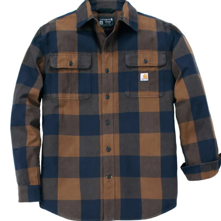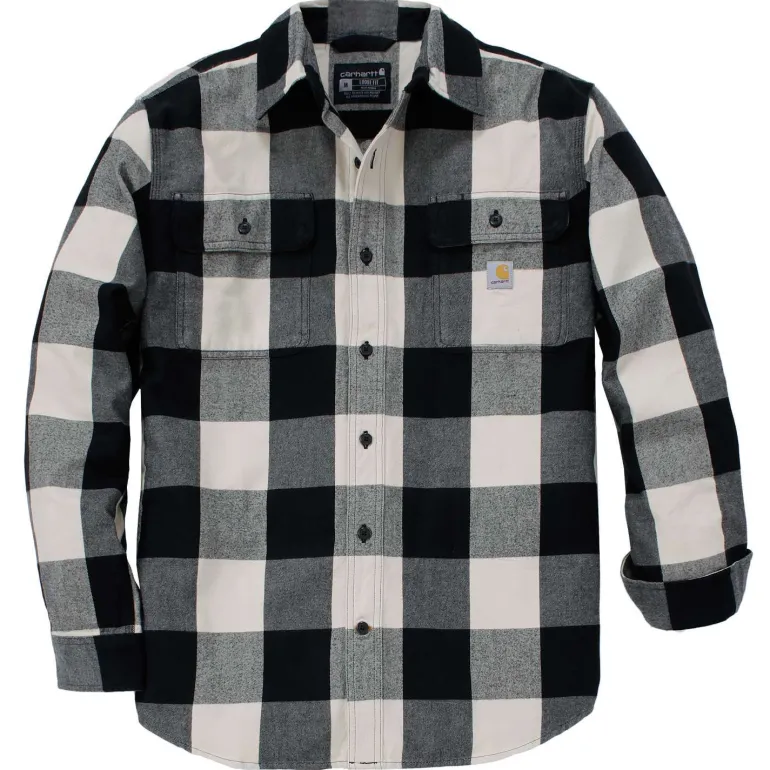 Carharttin mukava flanellipaita paksumpaa harjattua flanellikangasta (heavyweight cotton flannel). 100 % puuvillaa, harjattu kangas antaa pehmeän tuntuman. Loose Fit -istuvuus mahdollistaa liikkuvuuden ja kerrospukeutumisen. Erinomainen viileämpiin keleihin. Paidassa on klassinen kaulus, kaksi napillista rintataskua (vasemmassa rintataskussa käytännöllinen kynätasku), edessä nappilista ja napilliset hihansuut pidennetyillä halkioilla. Kolminkertaiset pääsaumat. Materiaali on esipesty pehmeämmän tuntuman ja kutistumisen vähentämiseksi.