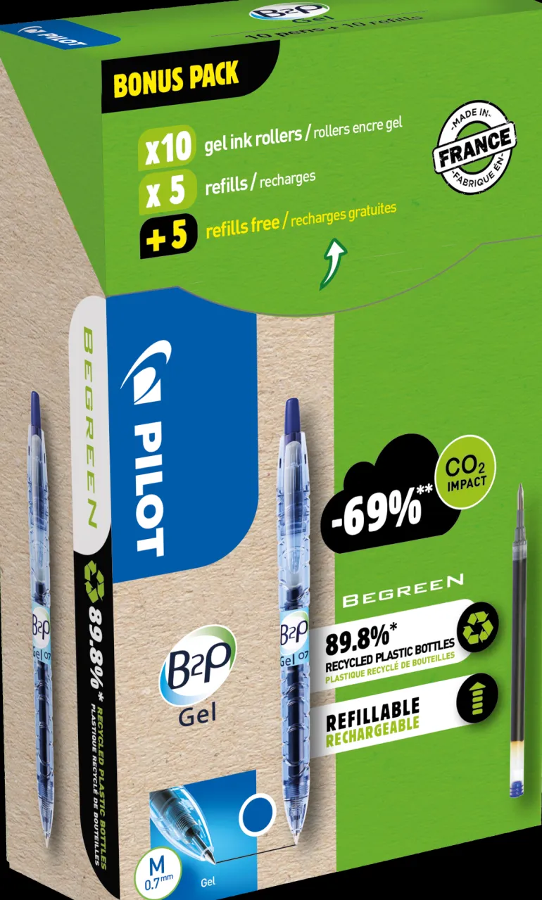 Pilot B2P Gel on geelikynä, joka on valmistettu 89-prosenttisesti kierrätetystä PET-pullojen muovista Pilotin ISO 14001 -sertifioidulla tehtaalla Ranskassa. Kynässä on sujuvakäyttöinen geelimuste, volframikuula kestävyyden takaamiseksi sekä kätevä napsautusmekanismi. Kynä on uudelleentäytettävä. Mustat ja siniset geelimusteet ovat ISO 27668-2 -standardin mukaisia (arkistointikelpoista). B2P-kynän valmistuksessa on hyödynnetty myös meristä, järvistä ja rannoilta peräisin olevaa muovijätettä. Sisältää 10 kpl kyniä + 10 täyttöpakkausta.