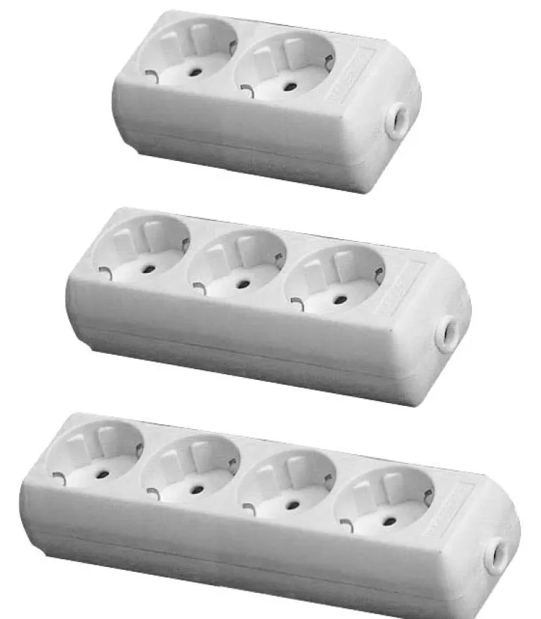 2-osainen harmaa maadoitettu haaroitusjatkojohto. Haaroitusjatkojohdossa ei ole kaapelia eikä kosketussuojausta.