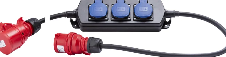 Haaroituspistorasia, jossa siirtymä 400 V:stä 3×230 V:hen Schuko ja jatkokytkentä CEE416-6:een. Varustettu itsekiinnittyvällä kannella, liitäntäkaapelilla RDOE (H07RN-F) 5G2,5 ja pistokkeella CEE416-6.
