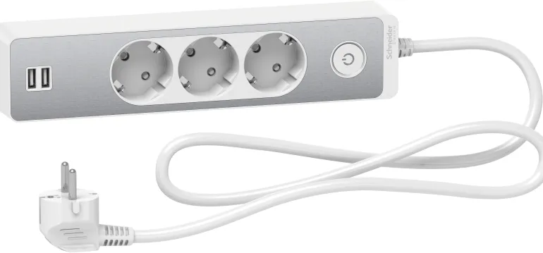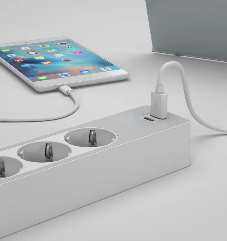 Vahva haaroitusjohto, jonka muotoilu on siisti ja saa mielellään olla näkösällä. Kaltevat pistorasiat. Haaraoitusjohdossa on kaksi USB A-liitäntää, jotka mahdollistavat puhelimien, tablettien ja muiden laitteiden nopean latauksen. USB-liitännät antavat yhteensä 2,4 A (maks. 2,4 A/portti).